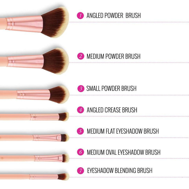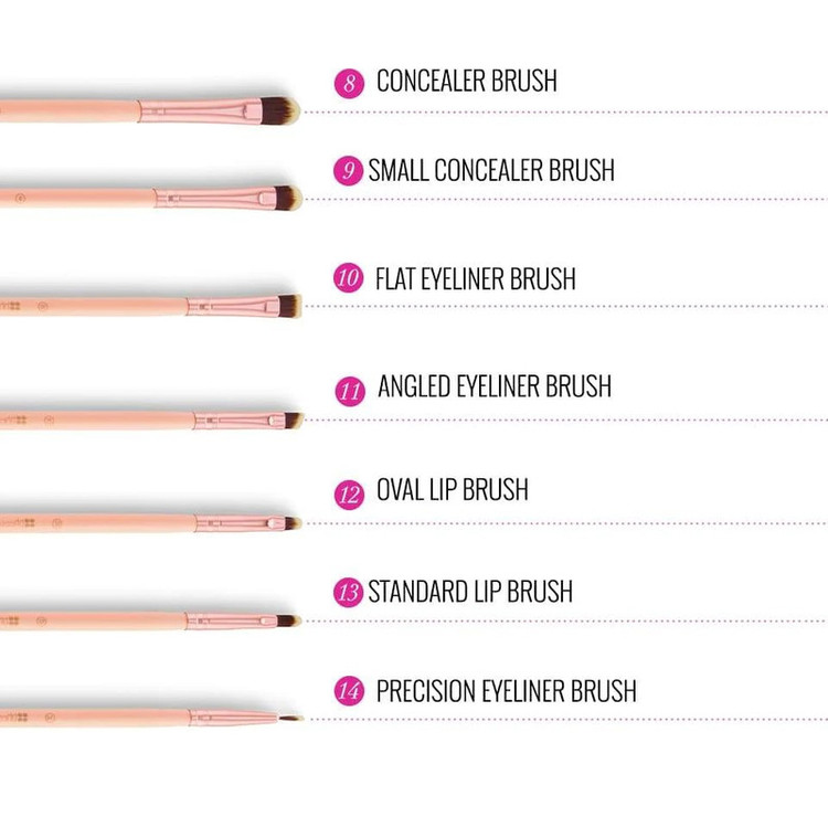 این مجموعه شامل یک استند جذاب به همراه 14 براش کاربردی و زیبا میباشد . این براش های ویژه به صورت عالی با مایعات،کرم ها و پودر ها کار میکنند و به خوبی آن ها را با پوست مخلوط میکنند و دارای عملکرد های متفاوت و بی نظیری هستند. کلیه براش های این مجموعه، گیاهی، فاقد گلوتن و تست حیوانی هستند. این مجموعه شامل براش های زیر است: براش پودر، براش پودر برنز بزرگ، بافینگ (های لایتر)، کانتور تخت، بلندینگ بزرگ، بلندینگ مخروطی، سایه، مدادی، کانسیلر تخت، سایه ابرو و کیف است.
