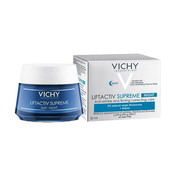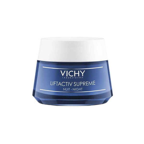 این کرم شب، یکی از محصولات برند ویشی (Vichy) و از سری تولیدات تخصصی ضدپیری و لیفتکننده Liftactiv Supreme است. این کرم مرطوبکننده غنی، چینوچروک پوست را کاهش داده و آن را سفتتر میکند. بههمین دلیل صبح روز بعد پوست خود را صافتر و محکتر احساس خواهیدکرد.کرم شب لیفت اکتیو ویشی با افتادگی و شلشدن پوست مقابله میکند و اثر لیفیتنگ آن تا مدت زمان طولانی باقی خواهدماند. در فرمولاسیون این کرم شب، یک ماده فعال طبیعی به نام رامنوز وجود دارد. این قند گیاهی اثرات پیری پوست را اصلاح و آن را نرم، صاف و مخملی میکند. علاوهبراین، وجود ویتامینC بهعنوان یک آنتیاکسیدان قوی، باعث روشنشدن پوست و کاهش اثرات پیری آن میشود.اسیدسولفونیک (Hepes) یک اسید مشتقشده مصنوعی است که آنزیمهای طبیعی پوست را فعال میکند و باعث حذف سلولهای مرده پوست و جوانسازی آن میشود. آب آتشفشانی ویشی از دیگر ترکیبات موجود در کرم شب ویشی مدل LiftActiv Supreme است. این آبگرم با 15 ماده معدنی غنی شده و اثربخشی آن بر روی تقویت سد دفاعی پوست و مبارزه با آسیب، از لحاظ بالینی بهاثبات رسیدهاست.